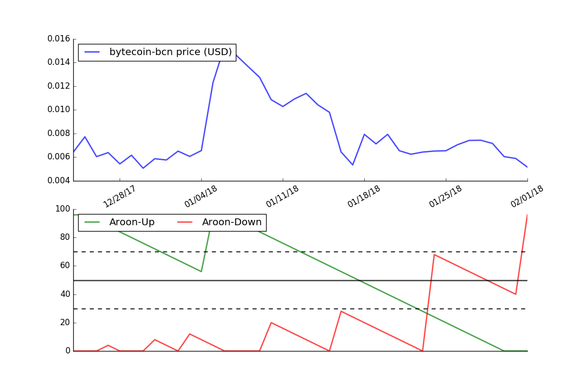 The graph below shows the Aroon Indicator using the price of Bytecoin-bcn over the last 40 days.