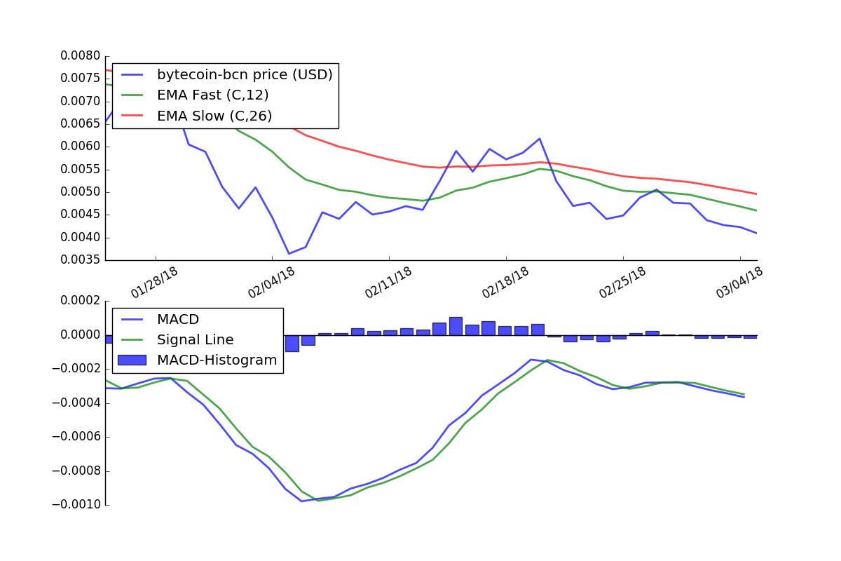 The graph below shows the MACD applied to the price of Bytecoin-bcn using daily price data for the last 40 days.