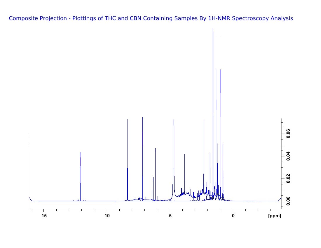 Figure 6. The superimposition of data from the previous figure has been coloured blue. This provides a composite which is very familiar to those who have analyzed cannabis samples by Proton Nuclear Magnetic Resonance Spectroscopy Analysis. Any samples which contain THC and CBN can be expected to have plottings similar to those of this composite. The issue with analysis of phyto-synthesized compounds is the difficulty in isolating them without use of destructive sample preparation and analysis methods. Gas chromatography and distillation provide data though not without causing changes in the chemical structures of compounds.