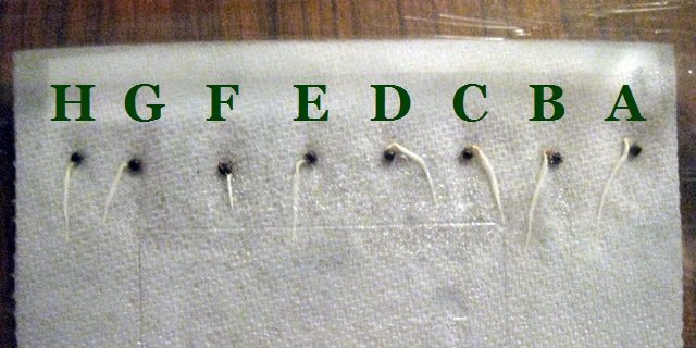 At 22 days old seedlings B, D, E, F, G, and H advanced into larger pots here: