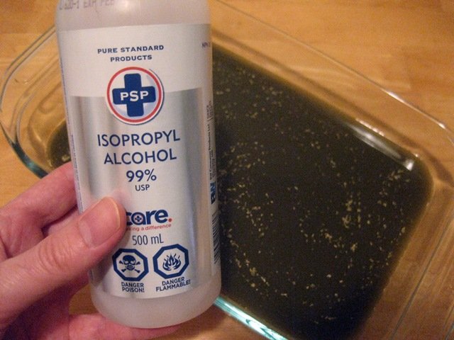 What I like about isopropyl is that it's available to the public. In some places, 'everclear' (95% grain ethanol) is available, and that's preferable. I don't have access to that right now. Isopropyl is understood - we've been using it on the body, and industrially, for generations. If used properly it's just like any tool. It comes with pros and cons. Iso does a good job of pulling out most of the cannabinoids and terpenes from the plant material, without too much else. It's not very expensive (about $4 for this job), and if you take the proper precautions, it's safe and easy to work with.