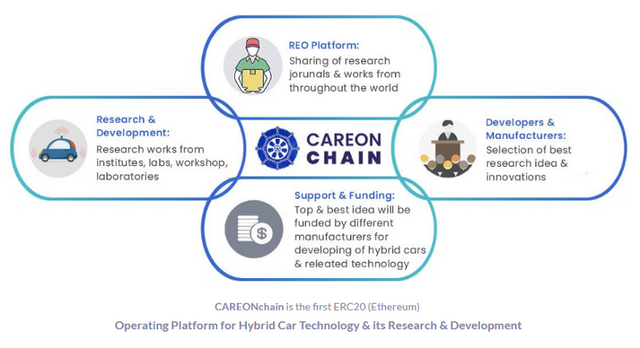 CAREON Chain is a blockchain-based platform that aims at providing a single forum for the sharing of hybrid vehicle data, projects, innovations, and research work. It seeks to achieve this by making the whole world act as a research, innovation, and development center for technology in the automotive sector for the development of hybrid cars. The platform seeks the generation of an interaction between developers, researchers, and manufacturers of hybrid vehicles across the world.