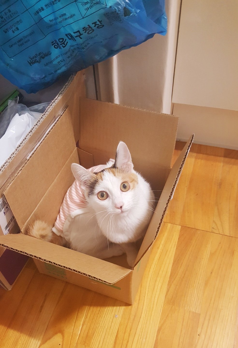 My cat is getting older and bigger. Here she is in a box. She got spayed a few days before this, so she is wearing that shirt to keep her from biting her stitches.