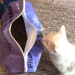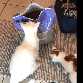 I love how cats behave. They small food and get 100% focused. My little fellows saw the open sack of dried animal food and started snatch some pellets.