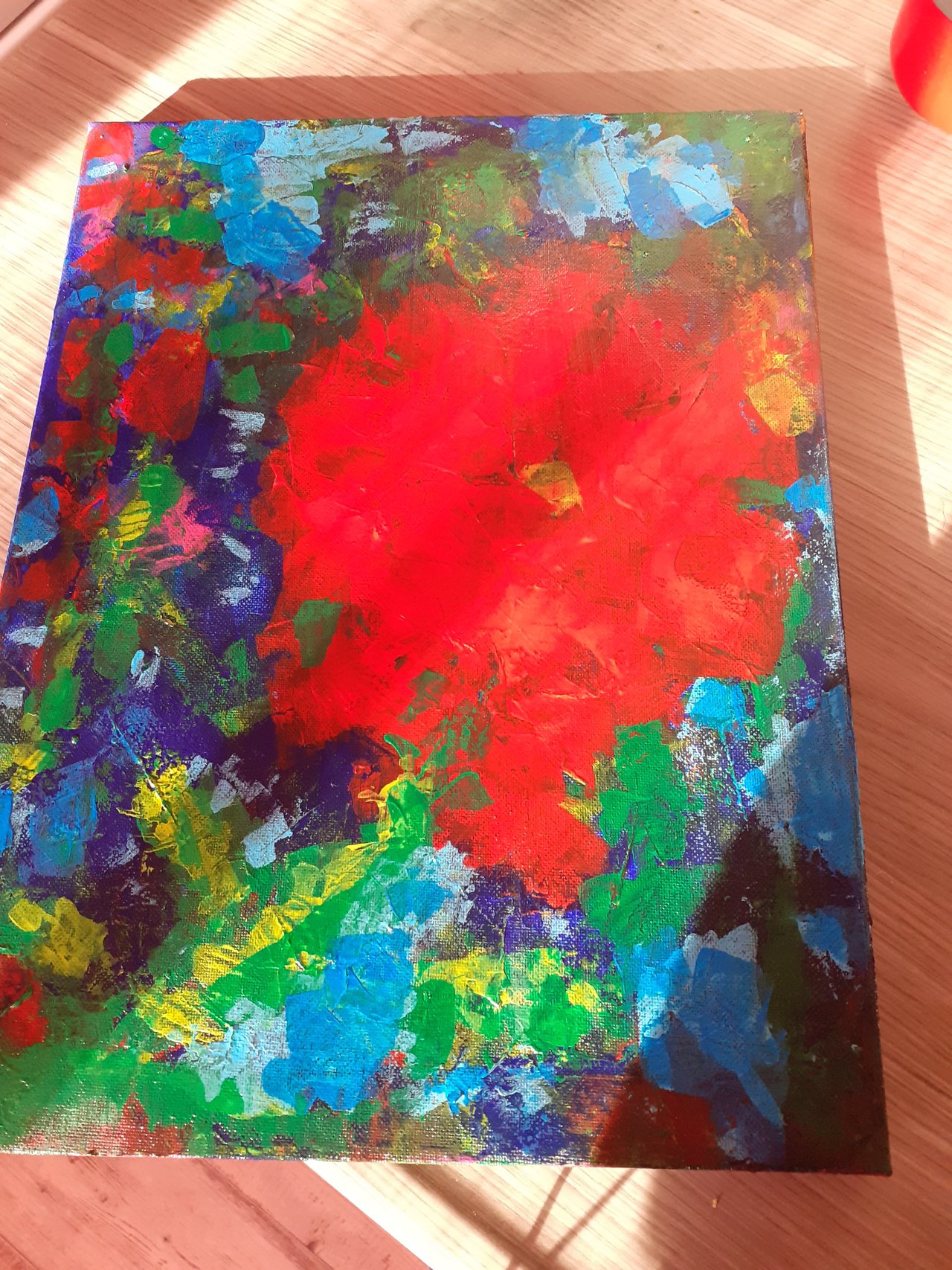 I think this is supposed to be a red flower that turned out looking more like abstract art. It really is beautiful and would be an eye-catching piece on anyone's wall. The last photo with the white wall enhanced the beauty of the painting. Congrats for a marvelous art creation.