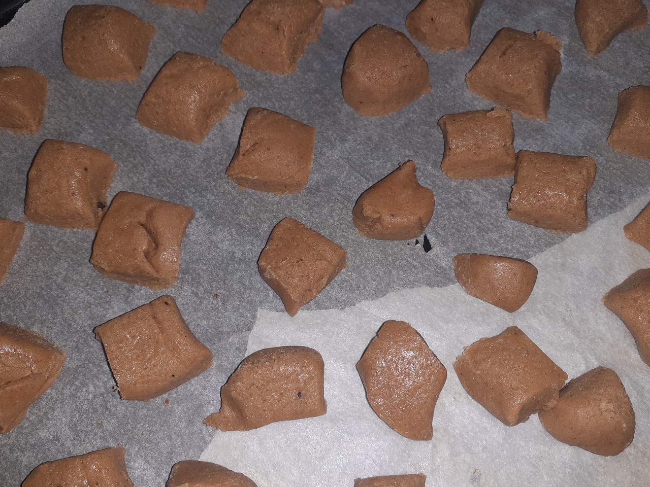 You make a dough out of honey, flour, bakingpowder and species. I used syrup instead of honey because I am allergic to it. Cut it in parts the size of sugar cubes and put some oil on it.
