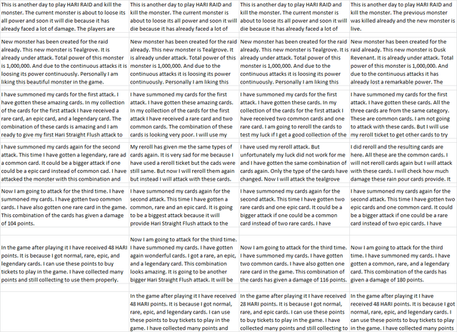 | I have summoned my cards again for the second attack. This time I have gotten a legendary, rare ad a common card. It could be a bigger attack if one could be a epic card instead of common cad. I have attacked the monster with this combination and damaged it by 186 points. | I have summoned my cards again for the second attack. This time I have gotten a common, rare and an epic card. It is going to be a biggest attack because it will provide Hari Straight Flush attack to the monster. I have attacked the monster with this combination and damaged it by 364 points. It was a good attack. | I have summoned my cards again for the second attack. This time I have gotten two rare cards and one epic card. It could be a bigger attack if one could be a common card instead of two rare cards. I have attacked the monster with this combination and damaged it by 170 points. | I have summoned my cards again for the second attack. This time I have gotten two epic cards and one common card. It could be a bigger attack if one could be a rare card instead of two epic cards. I have attacked the monster with this combination and damaged it by 214 points. |