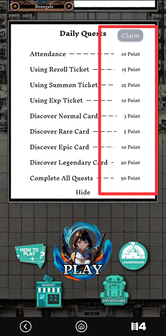 When I completed my attack, I came back to my home page. After going back to the home page, I saw my daily quest because I had enough legendary cards, rare cards, and normal cards. All of them had appeared. Thus, all the customs were completed. Then I clicked on the claim button to claim my reward. As soon as I claimed the reward, I saw that I had a total of 53 points. These are also very good points because they will buy us a ticket with which we can attack again.