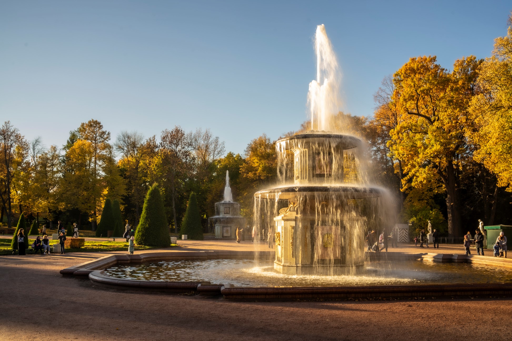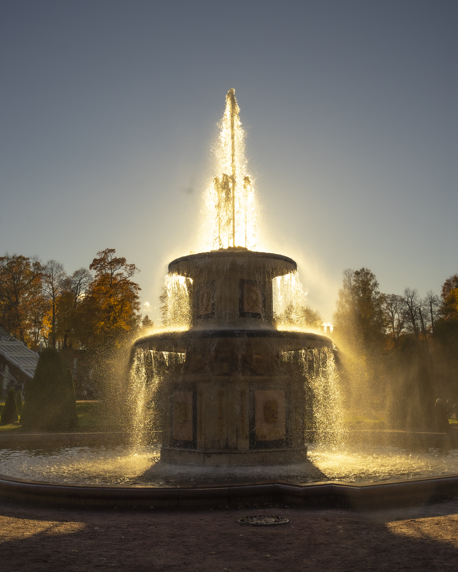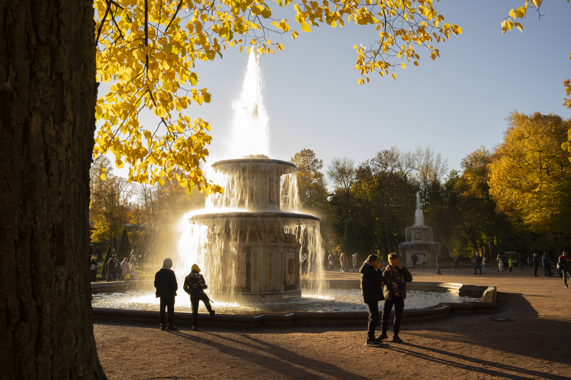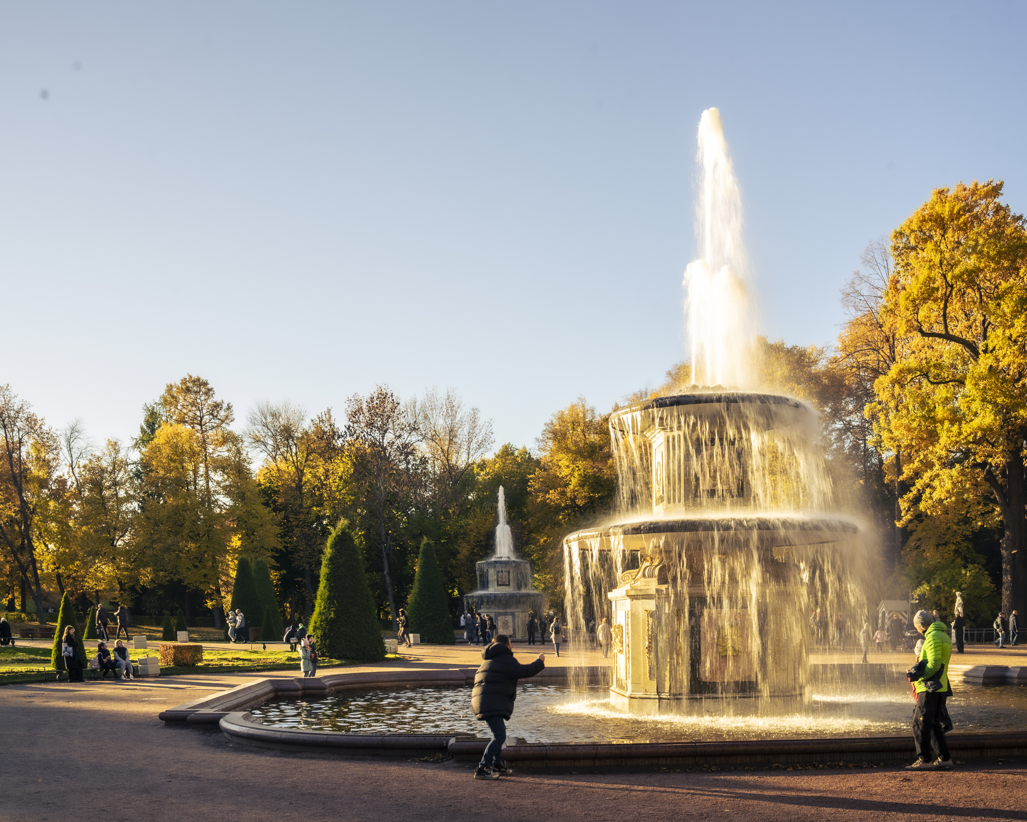 Кстати, летом в это время солнце ещё достаточно высоко и тут могло бы быть жарко или душно. Но так как правило не бывает. Одной стороной парк выходит на берег Финского залива. Да и сами фонтаны, их вода создают ощущение прохлады.