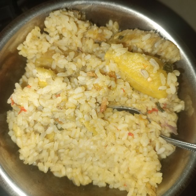 My graduate (sister) is back already and she's preparing rice and plantains, any time she's preparing food at the kitchen I don't near the kitchen because she won't let me do some tasting while she's cooking, so I stayed off till the food was serve.