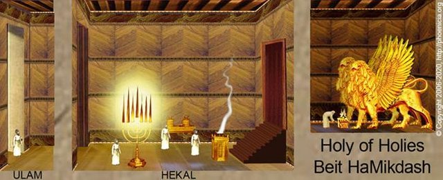 The third chamber called Kodesh Ha-Kodashim was the most sacred area of the temple and was located higher than the Hejal; you could only enter it by means of a ladder. Its shape was a cube of 10 meters on each side and in the center was the Ark of the Covenant, a large chest made of acacia wood and covered with gold plates, in which were kept the Tablets of the Law, where they found the 10 commandments engraved.