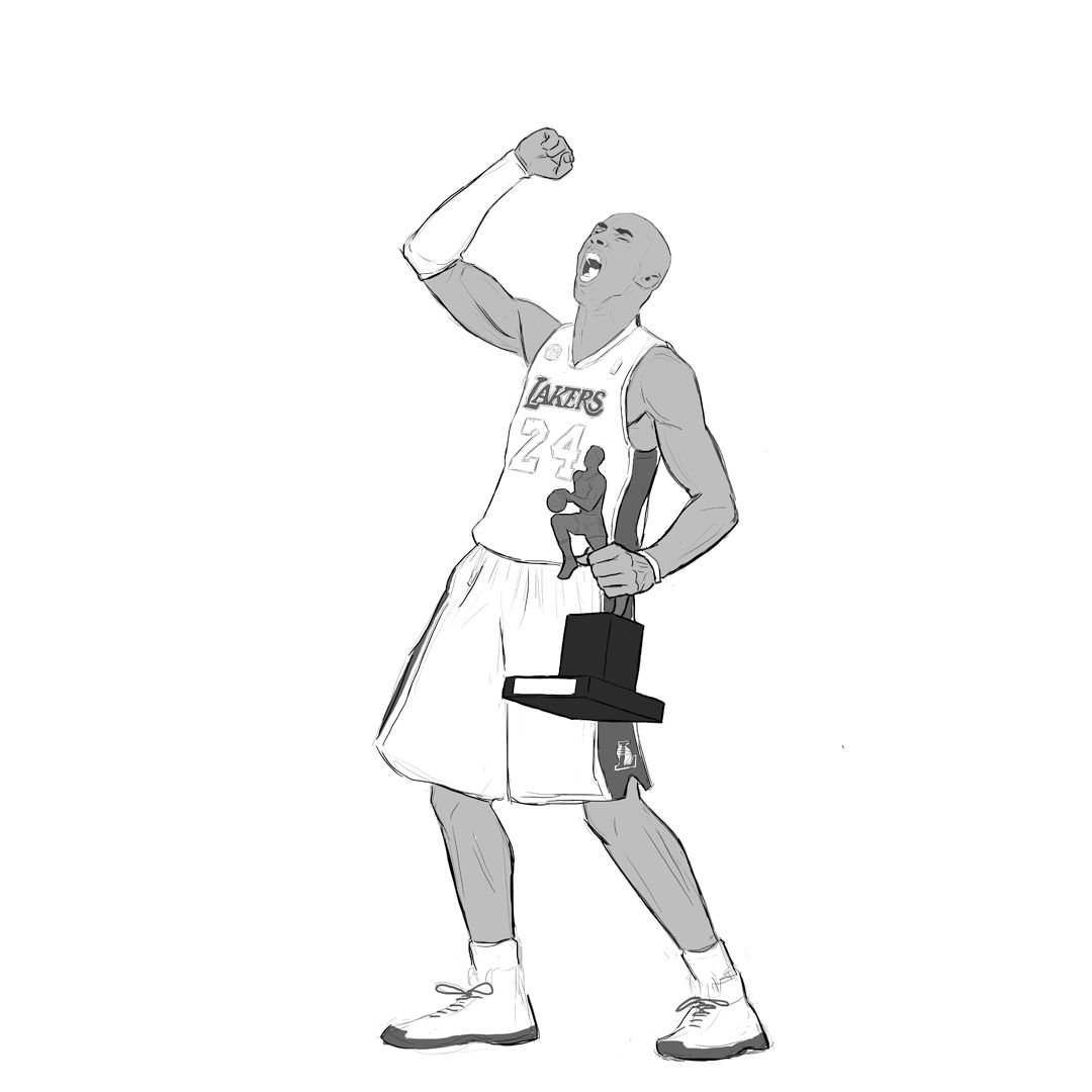 After the rough sketching of Kobe from the reference of one of his iconic moments roaring to the crowd (he is pinching both ends of THE LAKERS portion of the jersey) and altering it to include the MVP trophy in one hand and the other a fist pump. The client asked to lose the fist pump and do the pinch instead. I don't mind to make the changes but when I'm given creative freedom at first and then having to change the pose and redo some major detailing is not fun... as long as I keep to the notion that it's for the art and the client is a valued one, it's all good.
