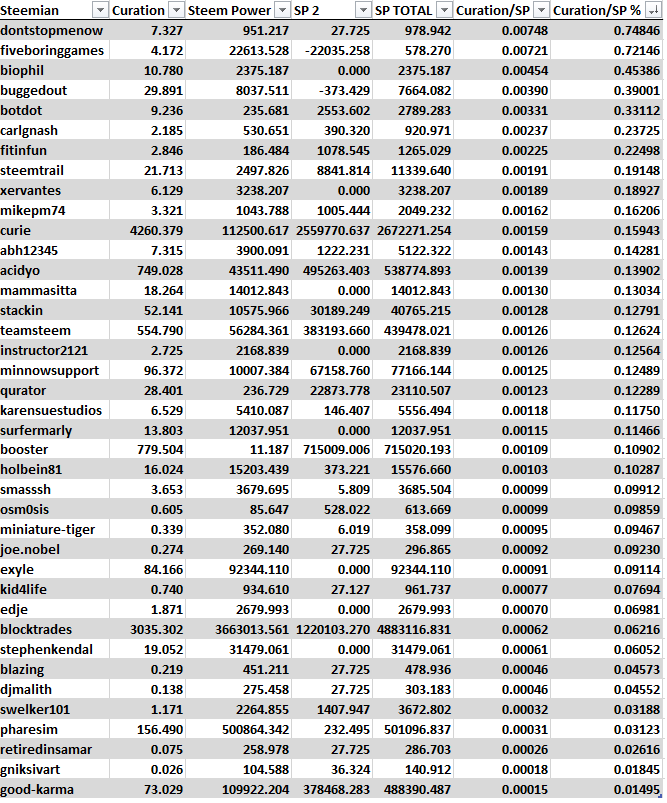 There were tons of familiar names that popped up on the list and it was based on Curation/Steem Power %. The data explains who are getting more bang for the buck on curation regardless of your Steem Power. 💰