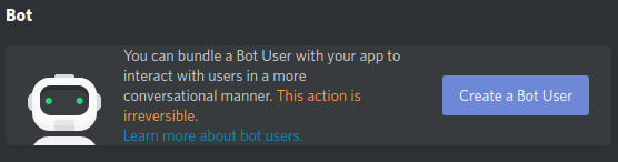 We need our bot to have a user in Discord, click on the Create a Bot User button: