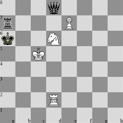 Now, here we have a 'KRNP vs kqr' mate in 3 chess puzzle created by a computer program, Chesthetica, using the approach known as the DSNS from the sub-field of AI, computational creativity. Depending on the type and complexity of the problem desired, a single instance of Chesthetica running on a desktop computer can probably generate anywhere between one and ten problems per hour.