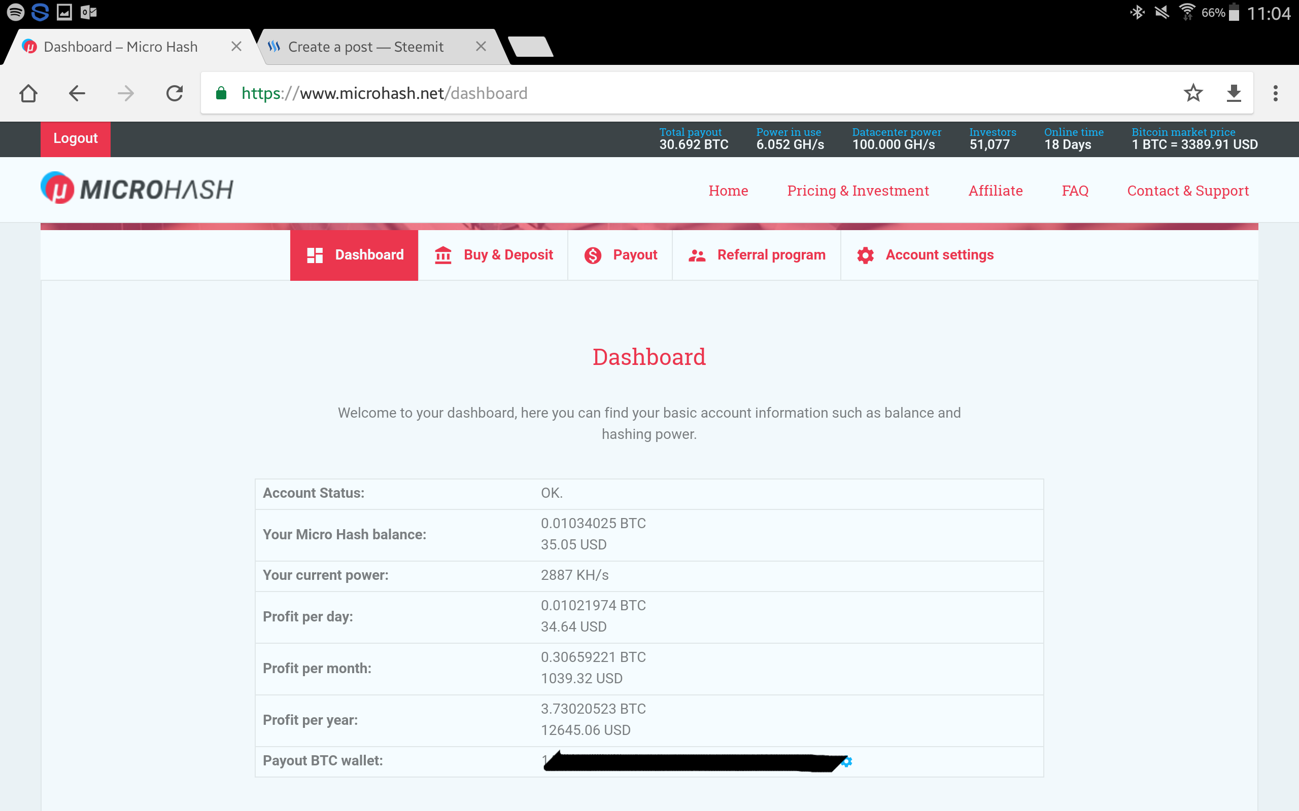 Ich kann nur jedem raten, die Finger von der Firma zu lassen.Das Problem wurde weitgehend gelöst. Der Versuch läuft also weiter. Wir werden berichten.@afrog Ja die eingezahlten BTC auszahlen lassen geht nicht. Man bekommt aber jeden Tag eine gewisse Summe, die man sehr wohl auszahlen kann. Also das initiale Investment bleibt dort, aber was man täglich erminent kann man sich dann auf die Wallet schicken. Nach 10 Tagen sollte der tägliche Gewinn höher sein, als der initiale Betrag. Ich habe gesehen, dass du nur die 10 KH/s hast. Könnte es sein, dass die Blockchain gerade so lange bruacht, so dass Micro Hash deinen Betrag noch nicht erhalten hat?