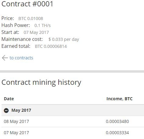 So far so good, the mining starts the day after your contract has been paid. I did pay on 6 may and the contract started at 7 may. So here are my first fresh mined bitcoins: