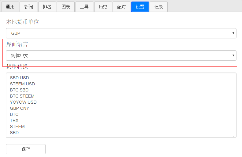 在这个界面设置里,我们还可以设置本地的法币,比如人民币。最下面的这个 “货币转换” 这是软件的精华。在这里,可以自定义我们想要看的信息,每一行就是一个查询命令。比如: