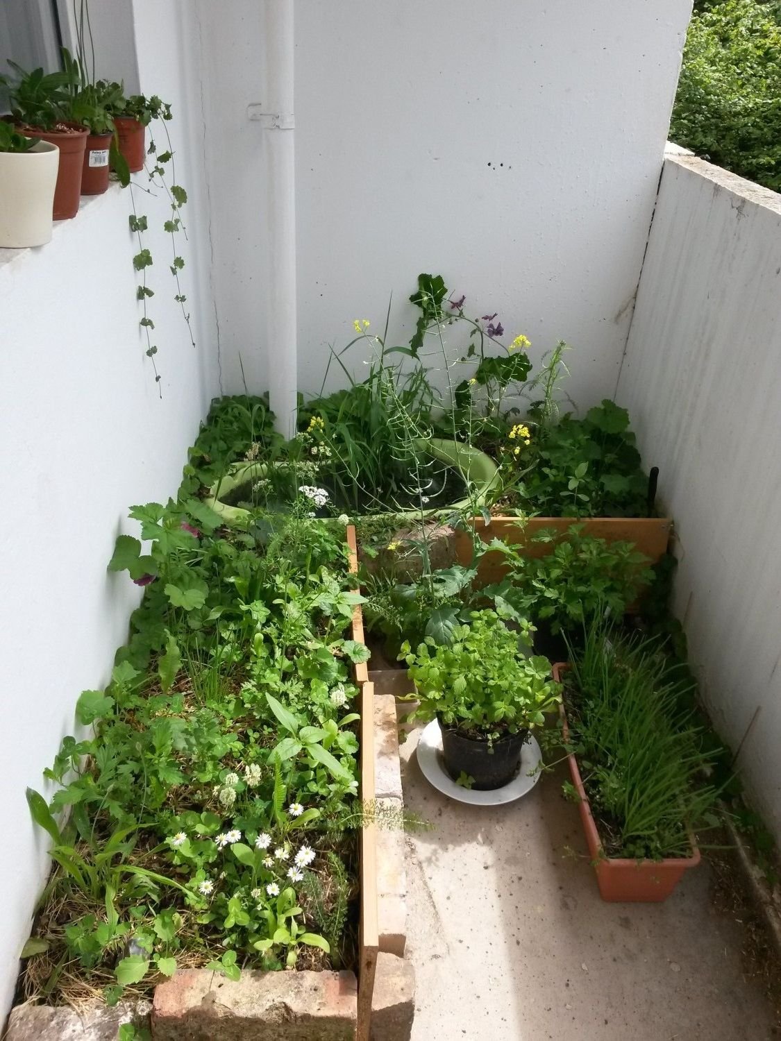 小澡盆改建的水塘算是我觉得最惬意之作吧, 可别小看, 它不仅可以像个空调一样营造出一个微环境, 还是灌溉的蓄水池, 平时厨余洗漱的中水都可以利用起来. 因为有水生植物睡莲, 水烛和浮萍, 还有从小溪里淘来的螺丝, 这个小水塘俨然成了一个污水净化池, 不但没有臭味, 还充满了活力, 回头再放几尾小鱼就完美了, 呵呵. 然后就是移栽植物, 当然所有都是可食用的, 密密麻麻有20多种, 随时就可以采收的.