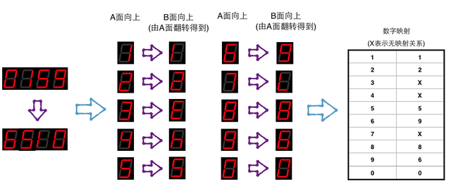 要解决这个问题,我们要需要建立一个数字当它A面相上时和B面向上时所表示的两个不同数字的映射关系。我们将这层关系叫做:数字映射。
