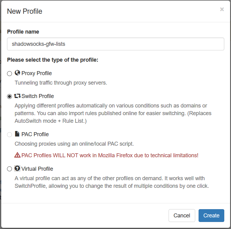 Profile Name填“shadowsocks-all”,类型选择第一项“Proxy Profile”,然后创建。在参数设定页面上,按照下图填写: