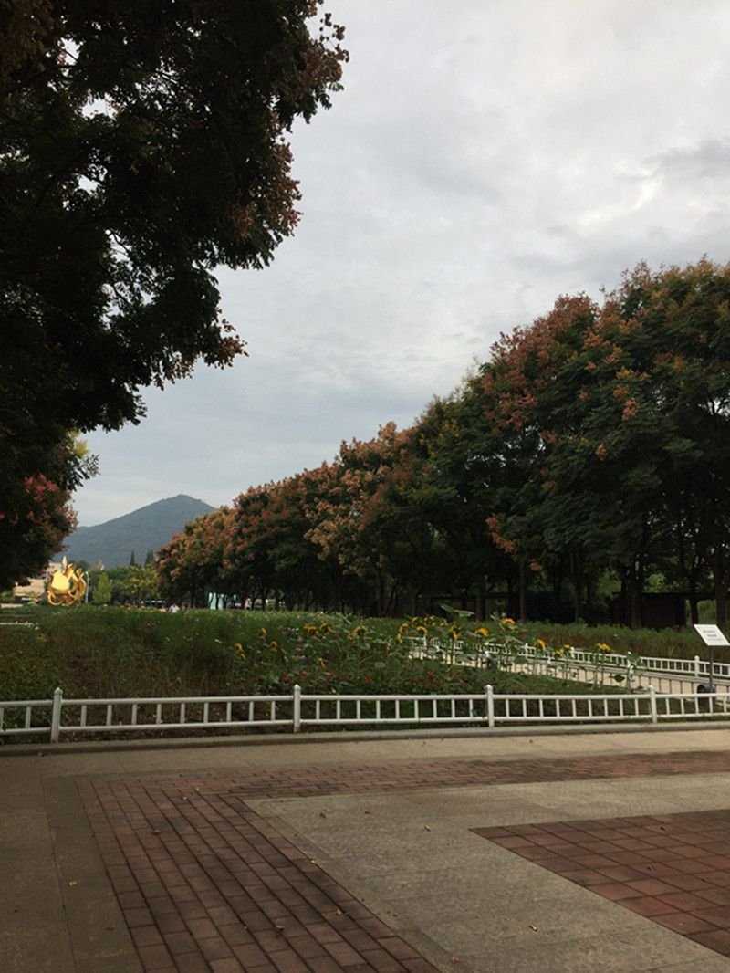 走过金色的雕像,入目的都是各种花,我能叫出名字的只有这个向日葵,还有一些红色的,淡紫色的花。花的两边是一排排树,立在那边,随风摆动,好似在欢迎每一位前来的客人。