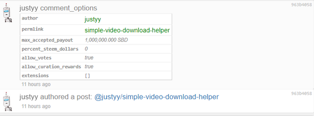 - 文章已经第一时间发表在了 steem 区块链上,就和平时写文章一样,在 steemit.com, steemd.com 等都是可见的。文章地址是:Simple Video Download Helper