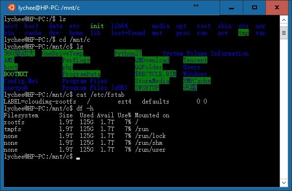 和CYGWIN不一样,WINDOWS系统文件是在被 mount 到 /mnt/c, /mnt/d 这个是比较符合逻辑的。