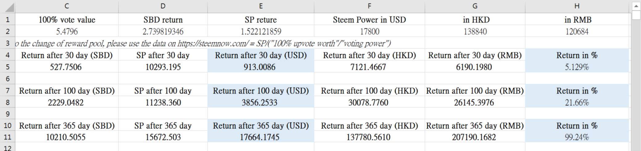 Thanks linuslee, really enjoy to use the excel such that i would know what may happen if i invest more money into steemit. I wonder what the return would be like if i convert my sbd into power as well, i am sure thre return will be more but by how much?