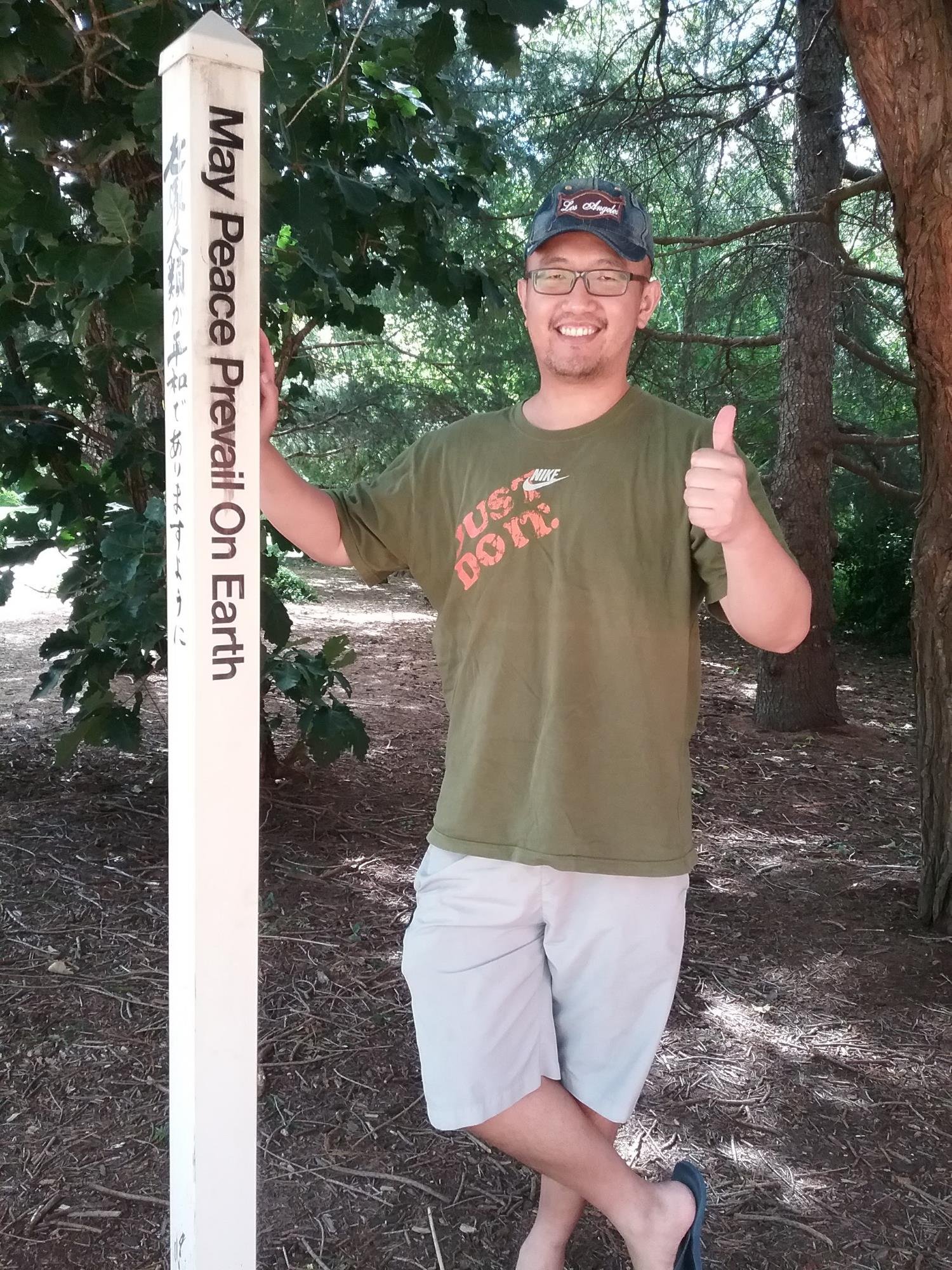 进门后可以看到一个写着英文"May Peace Prevail On Earth"的白色木柱。世界和平是我从小以来的愿望。我一定要为这几个字赞一下。