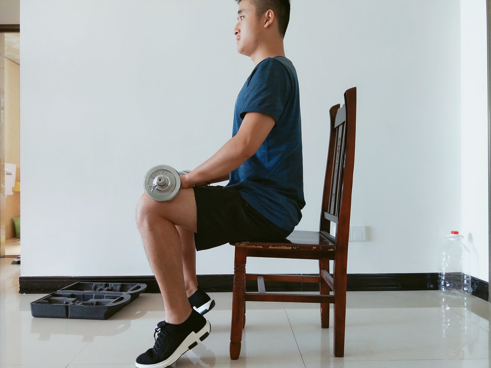 动作要领:坐在凳子上,上半身直立,大腿和小腿呈90度左右,选择合适重量的哑铃,将两只哑铃分别放在双腿上,手轻握哑铃防止滑落。然后踮脚,尽量踮高。共完成4组,每组16个,最后一组可多做几个。