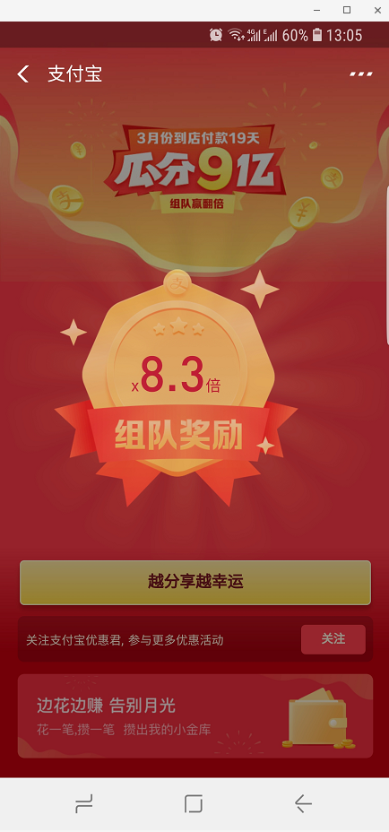 还记得之前马云发的花呗红包吗?每天都是十几二十的,爽的不得了。前段时间朋友又喊我组队瓜分9亿元的红包,听起来就很诱人,9亿啊,哪怕分我百万万分之一也好呀,遂果断参与。