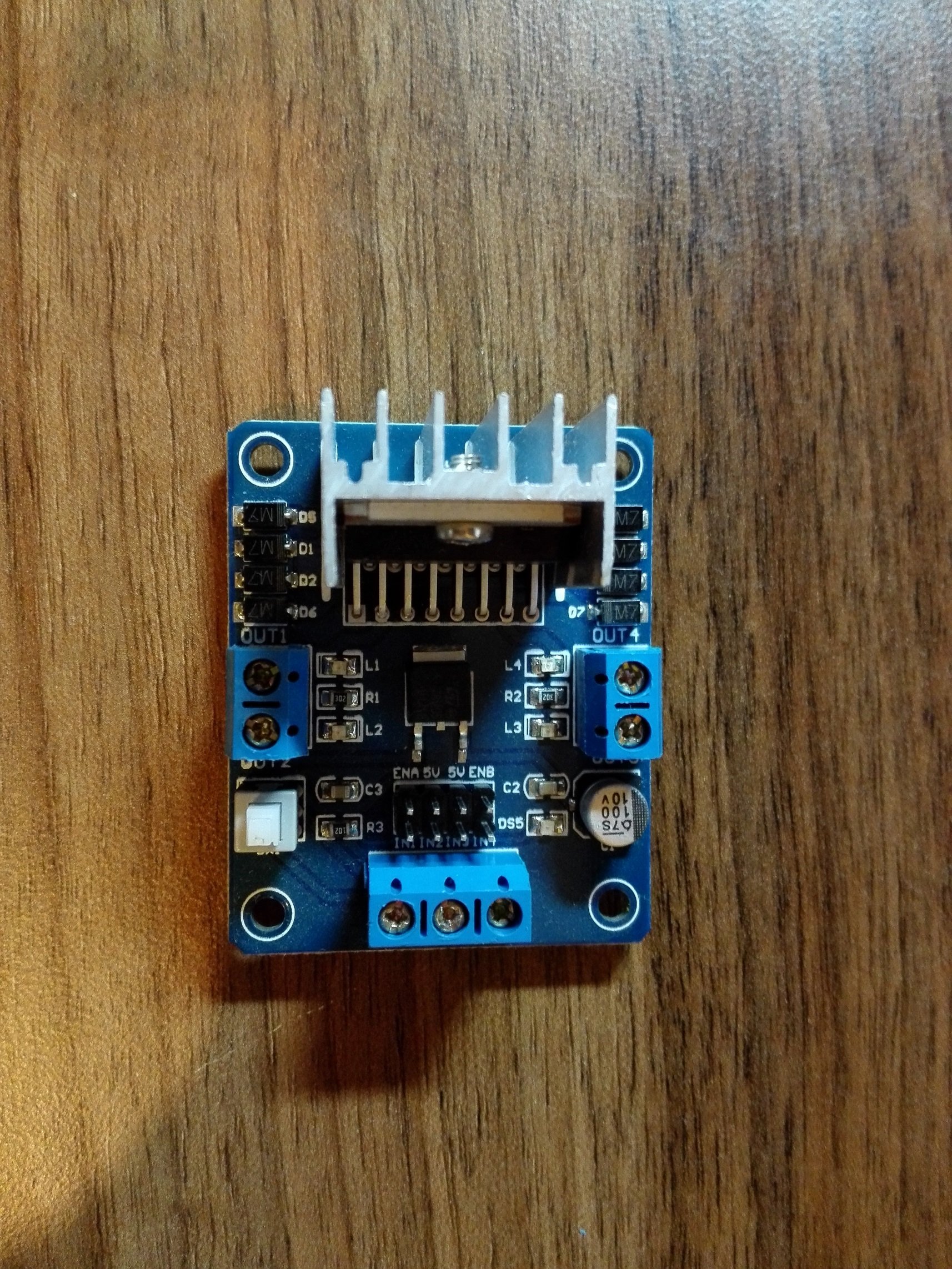 L298N电机驱动模块。控制电机前进后退都指望它了。我手头应该还有另外一款电机驱动模块,据说更好,然而我找不到丫了,等找到的时候可能替换成那个,先放这个图在这吧