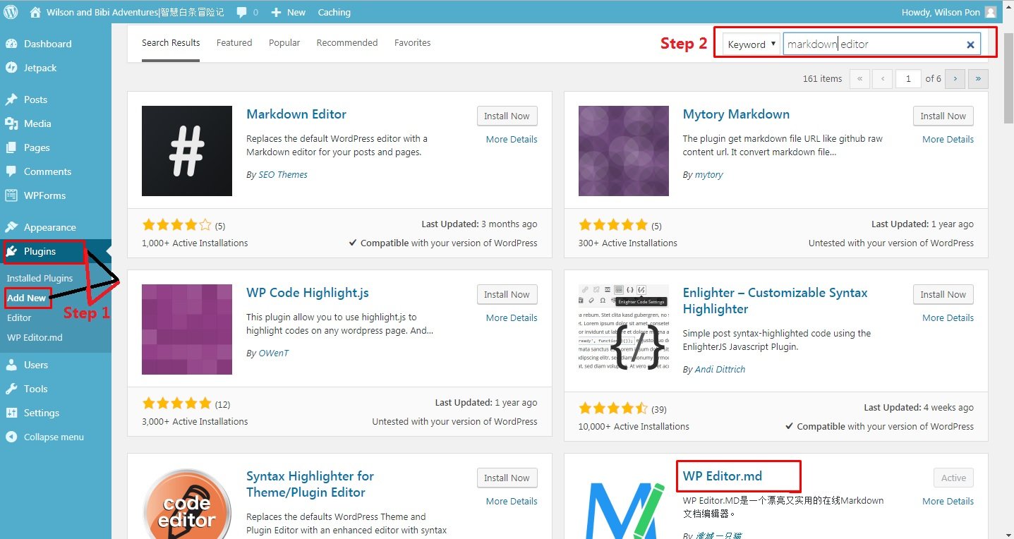 Step 2 - In the "Keyword" search box, type in "markdown editor". Choose the "WP Editor.md" plugin.