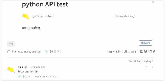 p = steem.post(title='', body='test commenting', author='yuxi', reply_identifier='@yuxi/python-api-test')