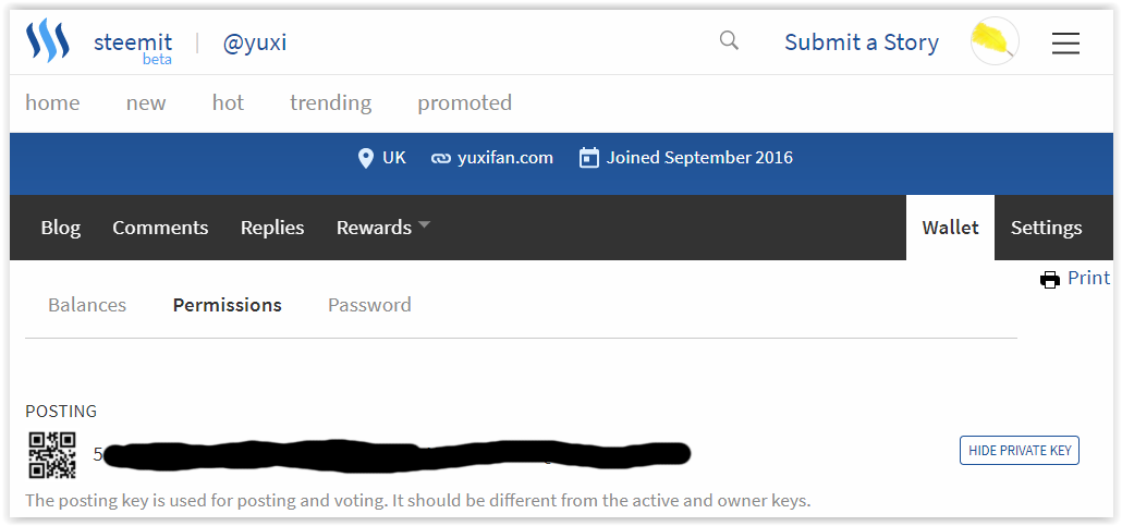 登陆你的Steemit账户后,点"Wallet" -> "Permissions",你会看到"POSTING"下面对应了一串很长的密码,不是这个,再点下"SHOW PRIVATE KEY",你会看到一个数字5开头的密码,这就是下面操作需要的密码了。下面的发帖,留言以及Upvote等操作只需要这个POSTING密码就够了。