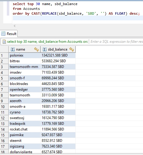 查看一下Steem中的各位土豪,这里只以账户中的SBD为例,需要注意的是sbd_balance中包含’SBD’字符,需要先去掉,然后再转换为数字才能进行正确排序: