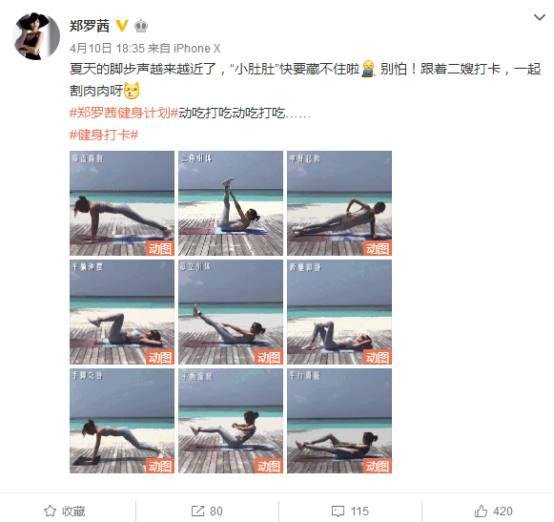 重点是,虽然是无意间成了粉丝们的“私教”,但郑罗茜却认真了,于是此后她的个人微博就开始持续更新健身gif组团。