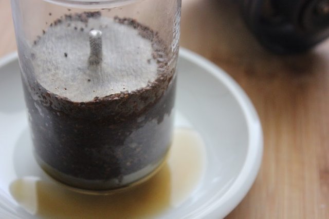 After that put the coffee into the middle container, put a filter on Top of it and pre-wet the coffee. The filter is there to distribute the water so that all the coffee stays wet all the time.