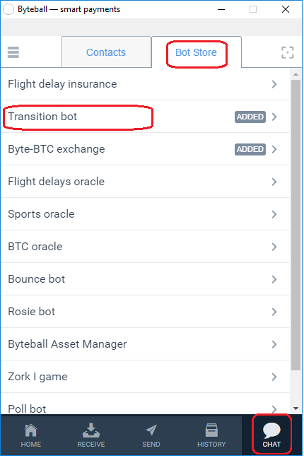 아래와 같이 [ CHAT ] - [ Bot Store] - [ Transition bot ] 을 차례대로 눌러주세요.