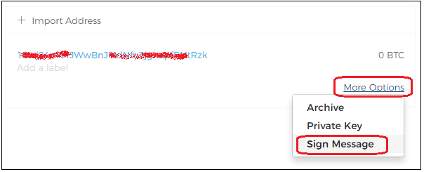 위에서 만든 주소 옆에 [ More Options ] - [ Sign Message ] 선택합니다.