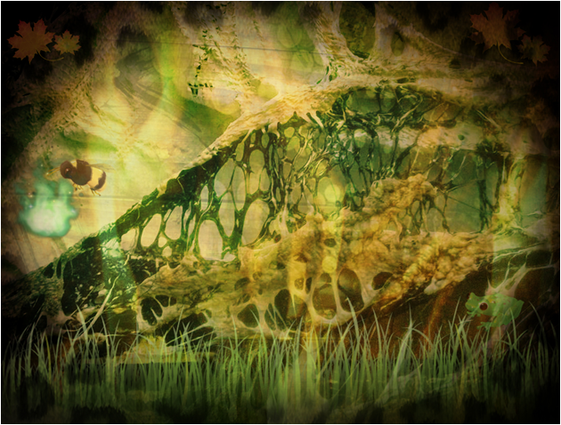 Wow @marioberlese. What a great imagination! This looks like a very large round headed creature with a mouth full of stringy and slimy spit! This is a great position and a potent perspective using the grass as you did in the foreground. Great job on this one! You really caught my attention!