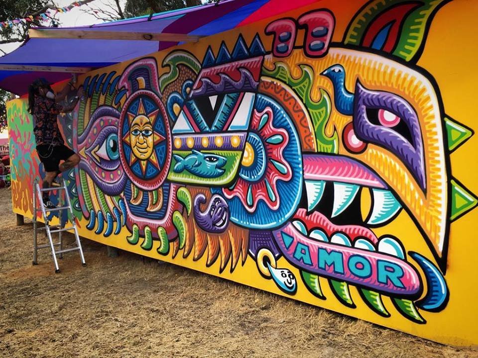 I did this big mural under the hot sun in Australia when I was there a few months ago on my tour. It was a challenge but I stayed focus and eventually got it done, as my service to the festival that hired me and for all the people who were watching it manifest as I was creating it. Thanks to all the festivals who hire me to decorate space for the tribes of weirdos and dancers and hippies and artists and spirit seekers and party people, Namaste!