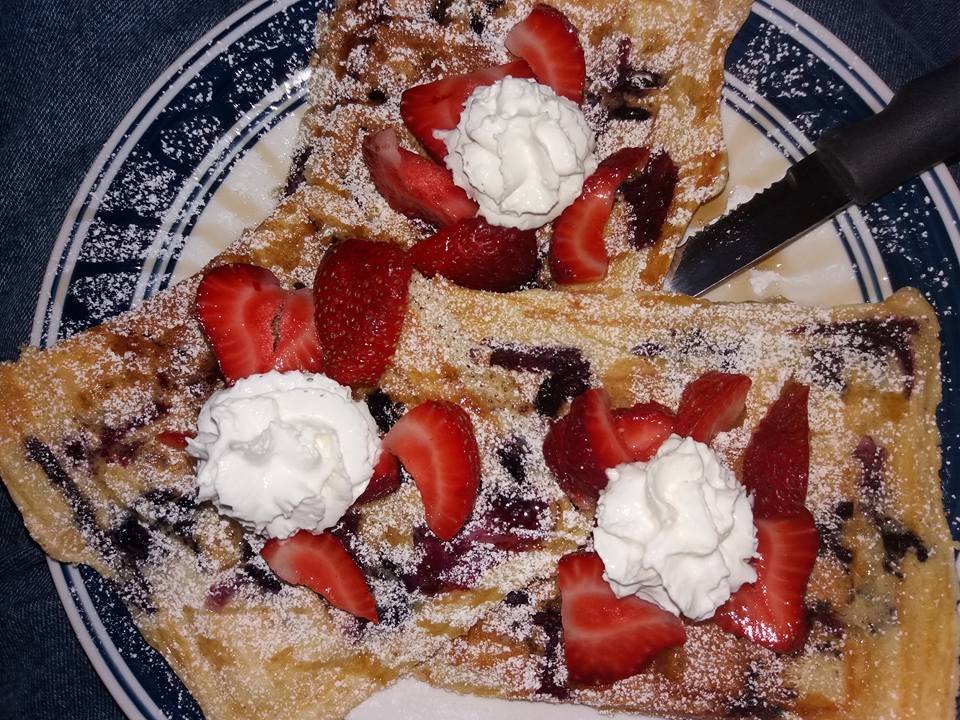 Finally a little breakfast... Blueberry waffles covered in fresh strawberries, whipped cream, a thin drizzle of honey, and a fine dusting of powdered sugar to make a great start to any day! I hope you enjoyed and have a wonderful day!