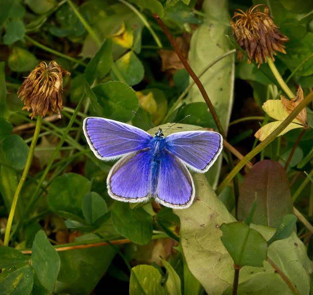 Here are two photos of blue butterflies for the colour theme of the day, indigo-ish enough I hope. Both are males; the females of the species are not nearly as blue, or even blue at all.