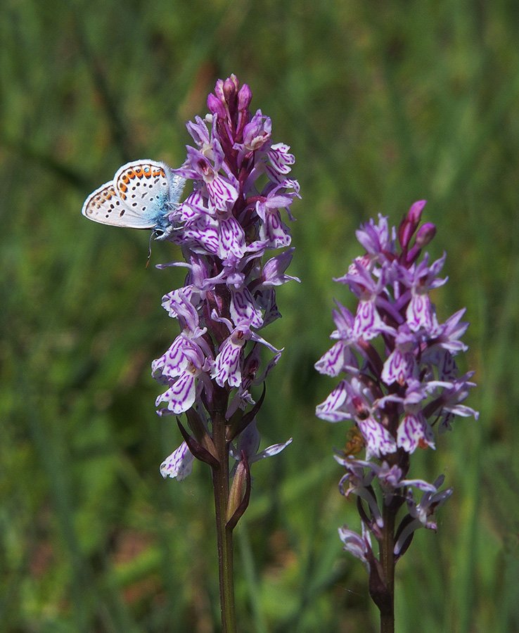 The butterfly in the photo is a silver-studded blue (Plebejus argus), heideblauwtje in Dutch. They usually live on heather, but this one decided to give the nearby orchids a go:
