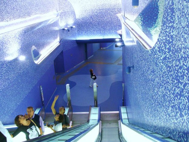 And here's the solution. I took the photo in the Toldeo underground station in Naples. While several underground stations have been redesigned for technical reasons some of them were transformed into pieces of art. The Toledo Metro Station was opened in September 2012. It's design was developed by the Spanish company Oscar Tusquets Blanca. Reaching down to 50 meters underground, it is the deepest metro station along the Linea 1. As one of Metro Napoli’s Metro Art Stations, it design revolves around the themes of water and light. The artwork includes two William Kentridge mosaics, Robert Wilson’s Light Panels and works by Achille Cevoli.