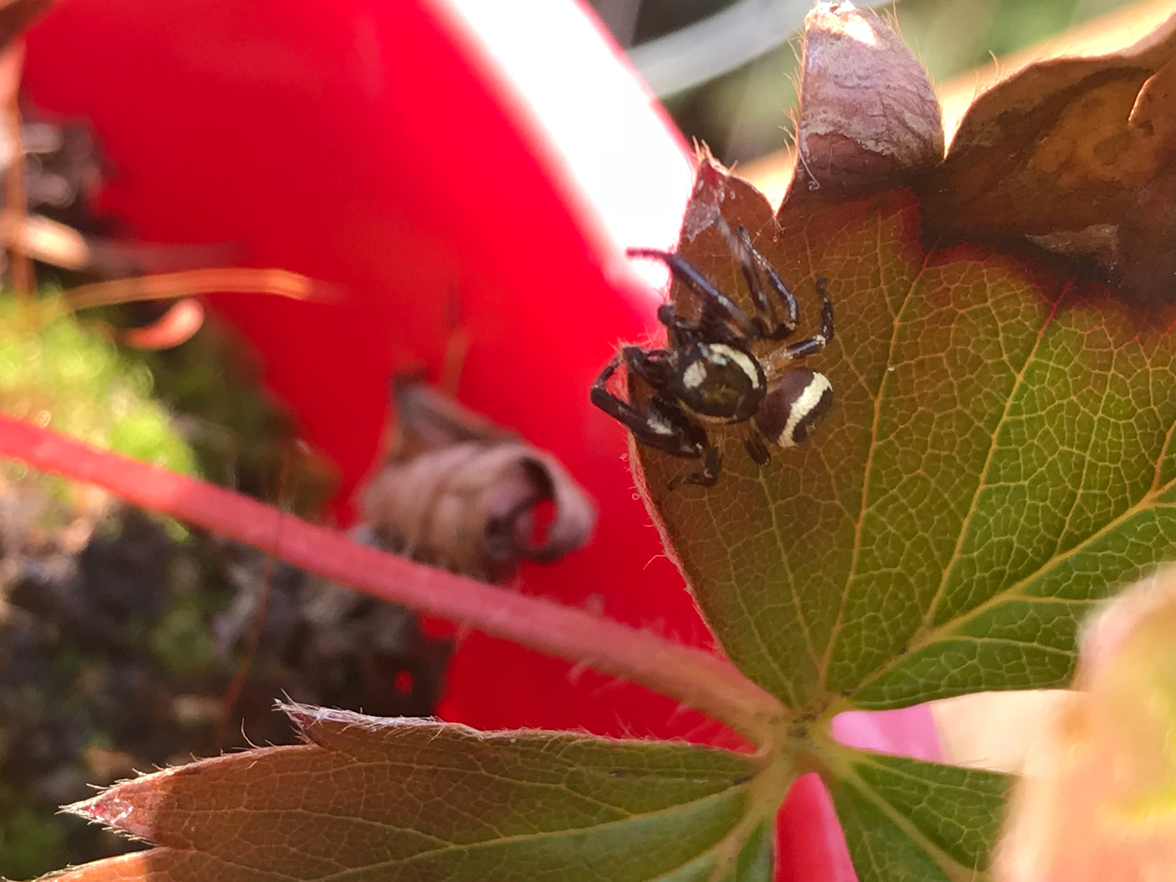 Macro photo of wolf spider on my strawberries. Not only is the hanging planter red, but the stem of the plant is as well.