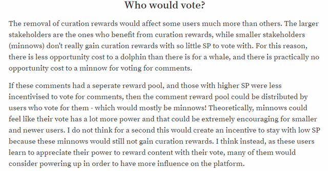 For that reason I think smaller voters having more power over the comment reward pool, because of whales lowered incentive to vote for comments would have a very positive impact on the platform. Remember these minnows don't get curation rewards - so this does not remove the incentive to power up or lower the demand for steem!