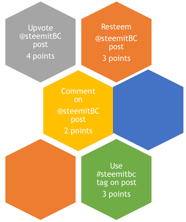 Here’s how it works. Points are awarded for different challenges. There are community growth challenges whose aim is to grow the SteemitBC account so we can further support you, our community members and there are Extra challenges. The aim of these Extra challenges is to help you grow your steemit account, gain authority in your field, and help propel you to the exposure you deserve.